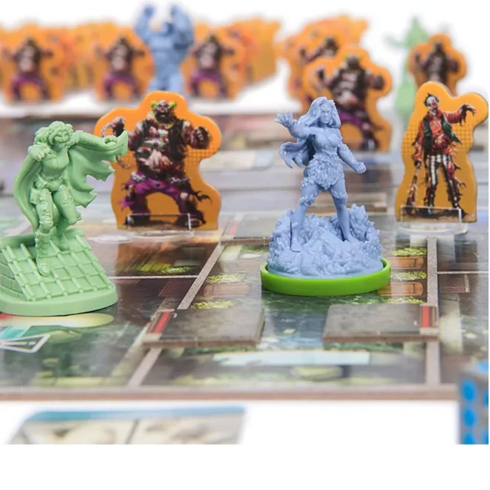 - Componentes incluidos: 6 miniaturas de Superhéroes, 4 miniaturas de Héroes Zombis, 6 figuras de Transeúntes, 50 figuras de zombis, 4 peanas de colores, 8 indicadores, 4 medidores de Experiencia, 6 dados, 4 módulos de tablero de doble cara, 6 tarjetas de identificación, 83 minicartas, 35 fichas, 1 reglamento