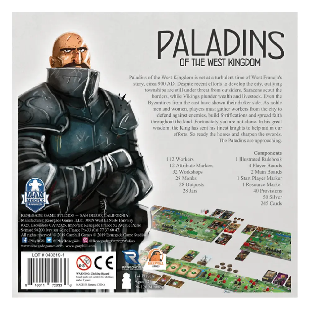 ¡Construye tu legado medieval y defiende el reino con honor! Paladins of the West Kingdom es un eurogame estratégico de peso medio donde te conviertes en un poderoso señor feudal en la Alta Edad Media. Recluta paladines, envía monjes a convertir a los paganos, comercia con mercaderes y fortalece tus defensas contra invasiones vikingas y sarracenas.