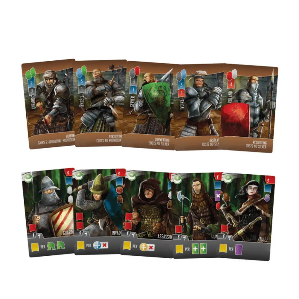 2 Tableros principales (en 2 partes), 4 Tableros de jugador a doble cara, 48 Cartas de Paladín. 32 Cartas de Aldeanos, 36 Cartas de Extranjeros, 10 Cartas de Favor Real (sello verde), 6 Cartas de Orden Real (sello rojo), 24 Cartas de Deuda, 24 Cartas de Sospecha, 24 Cartas de Taberna, 24 Cartas de Muralla, 17 Cartas de Intriga (para modo solitario), 50 Monedas de plata, 40 Provisiones, 1 Marcador de jugador inicial, 1 Marcador de recursos (para modo solitario), 22 Trabajadores, 18 Guerreros, 32 Talleres, 28 Puestos avanzados, 18 Exploradores, 18 Clérigos, 28 Monjes, 28 Vasijas (4 de cada número), 18 Comerciantes, 18 Criminales, 12 Marcadores de atributo (4 de cada color)