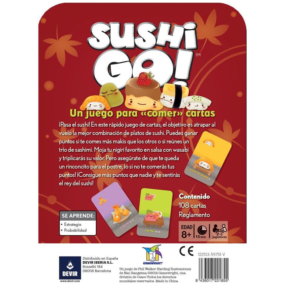 ¡El juego de cartas más apetitoso y rápido que existe! Sushi Go! en español es un juego rápido imprescindible de selección y colección de conjuntos donde los jugadores ‘comen’ cartas para crear el menú de sushi perfecto. En cada ronda eliges una carta de tu mano y pasas el resto al siguiente jugador – toda la estrategia está en decidir qué sushi tomar y qué dejar ir.